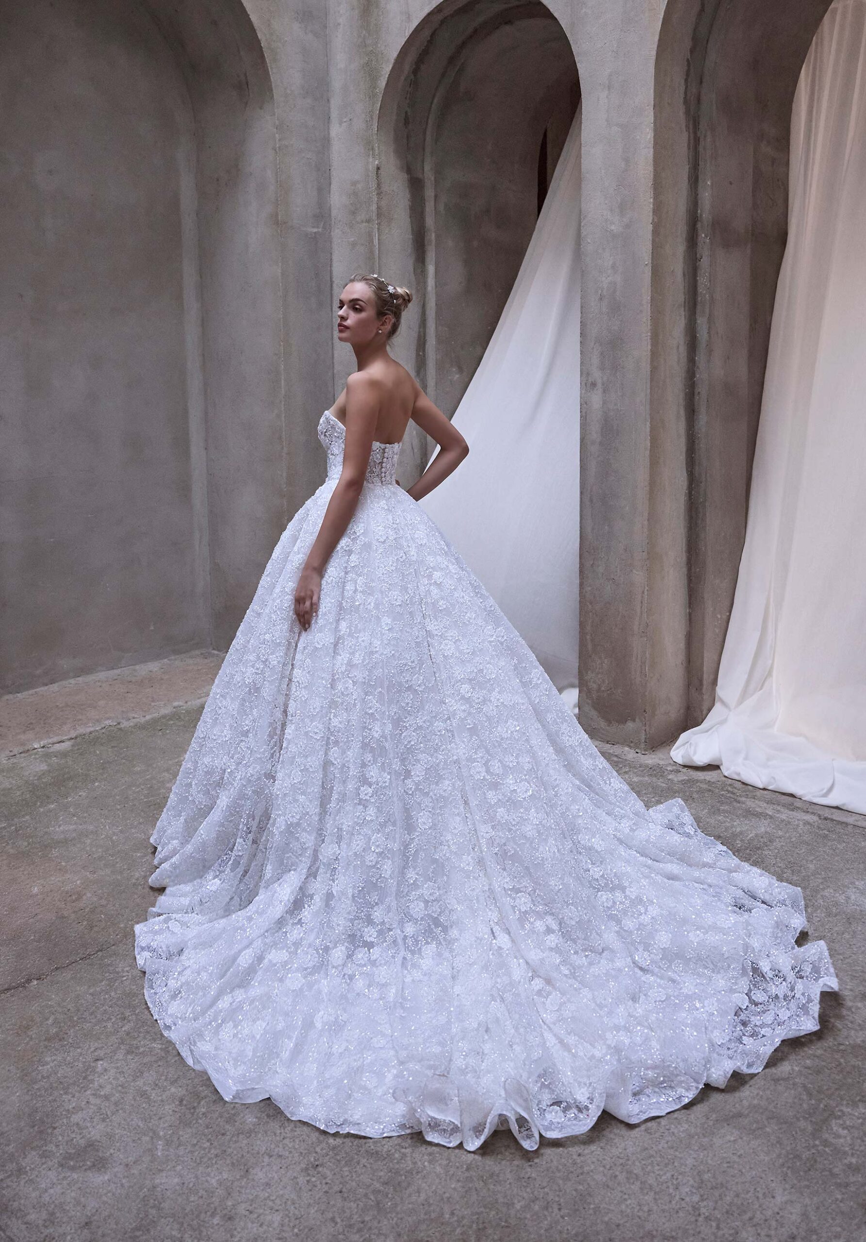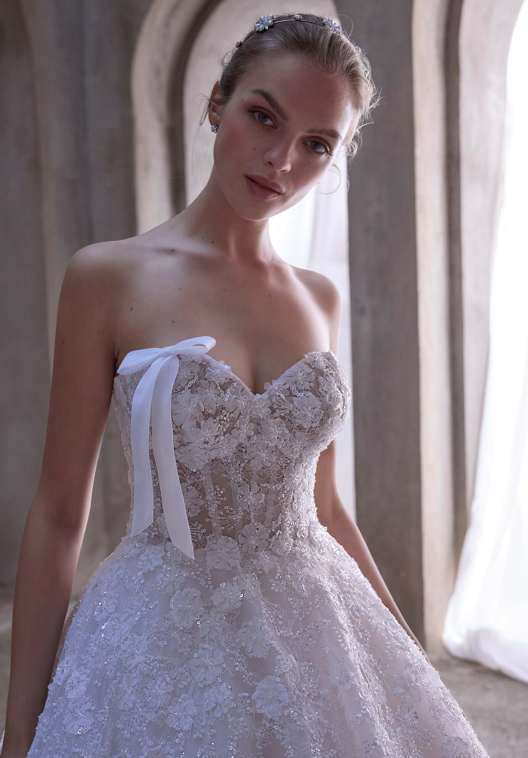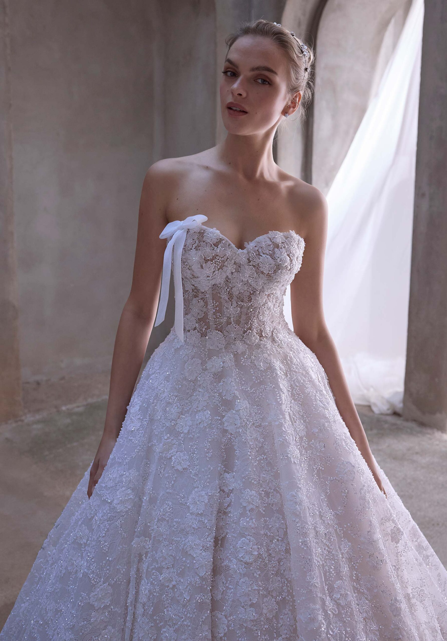 Vestido de noiva estilo princesa com decote coração num corpete transparente com armação, com uma fita de cetim destacável em renda Chantilly floral realçada com lantejoulas.