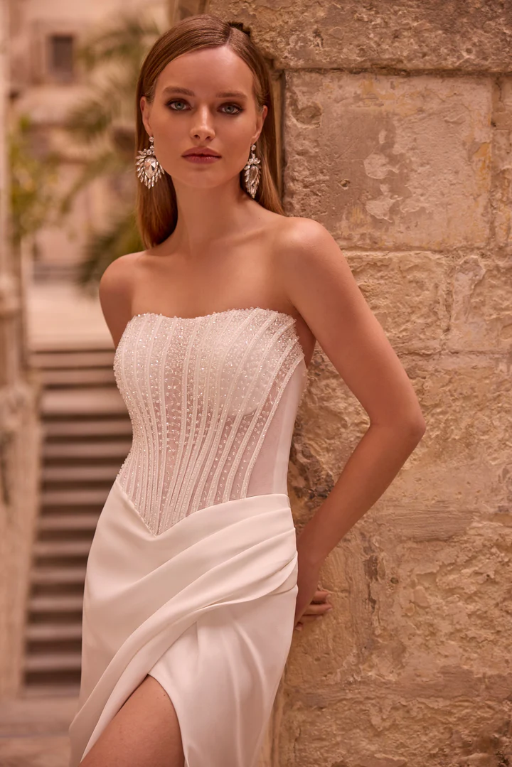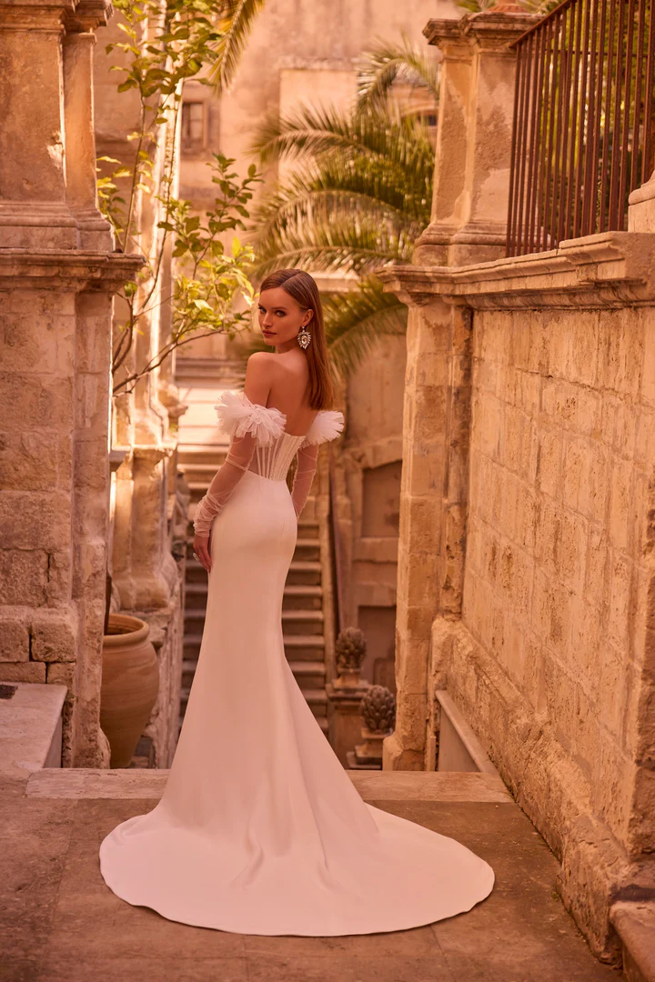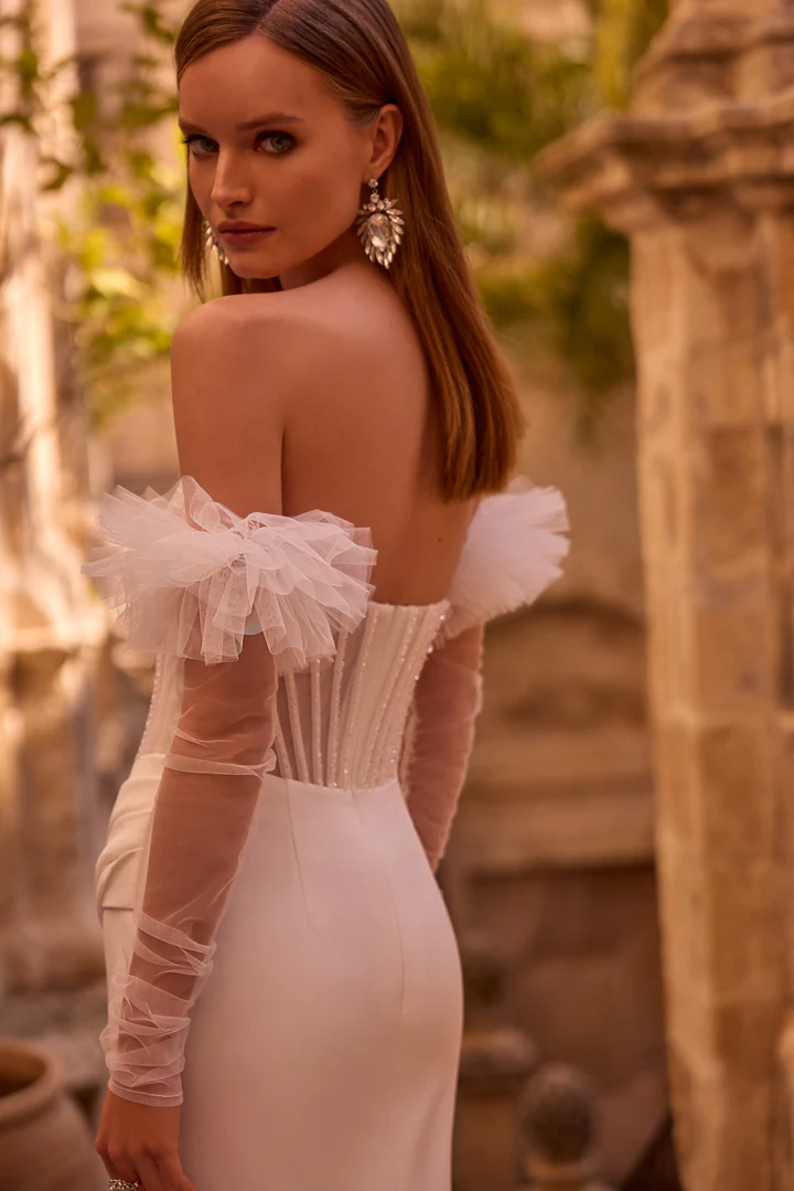 Um vestido de noiva fit and flare – ajustado até o quadril e levemente aberto na saia -, com fenda alta na coxa, apresentando corpete transparente bordado com pedrarias e mangas bufantes transparentes destacáveis.