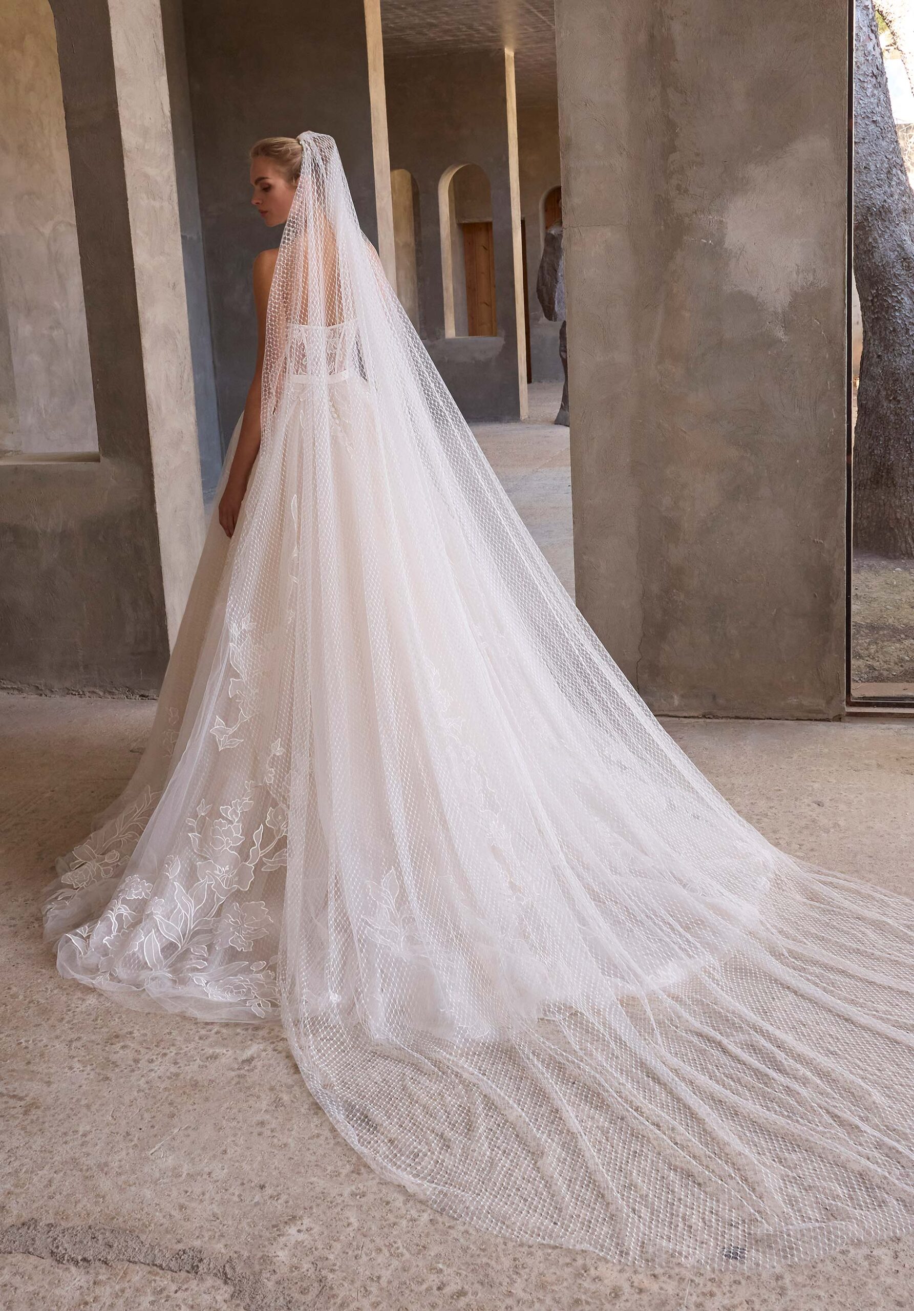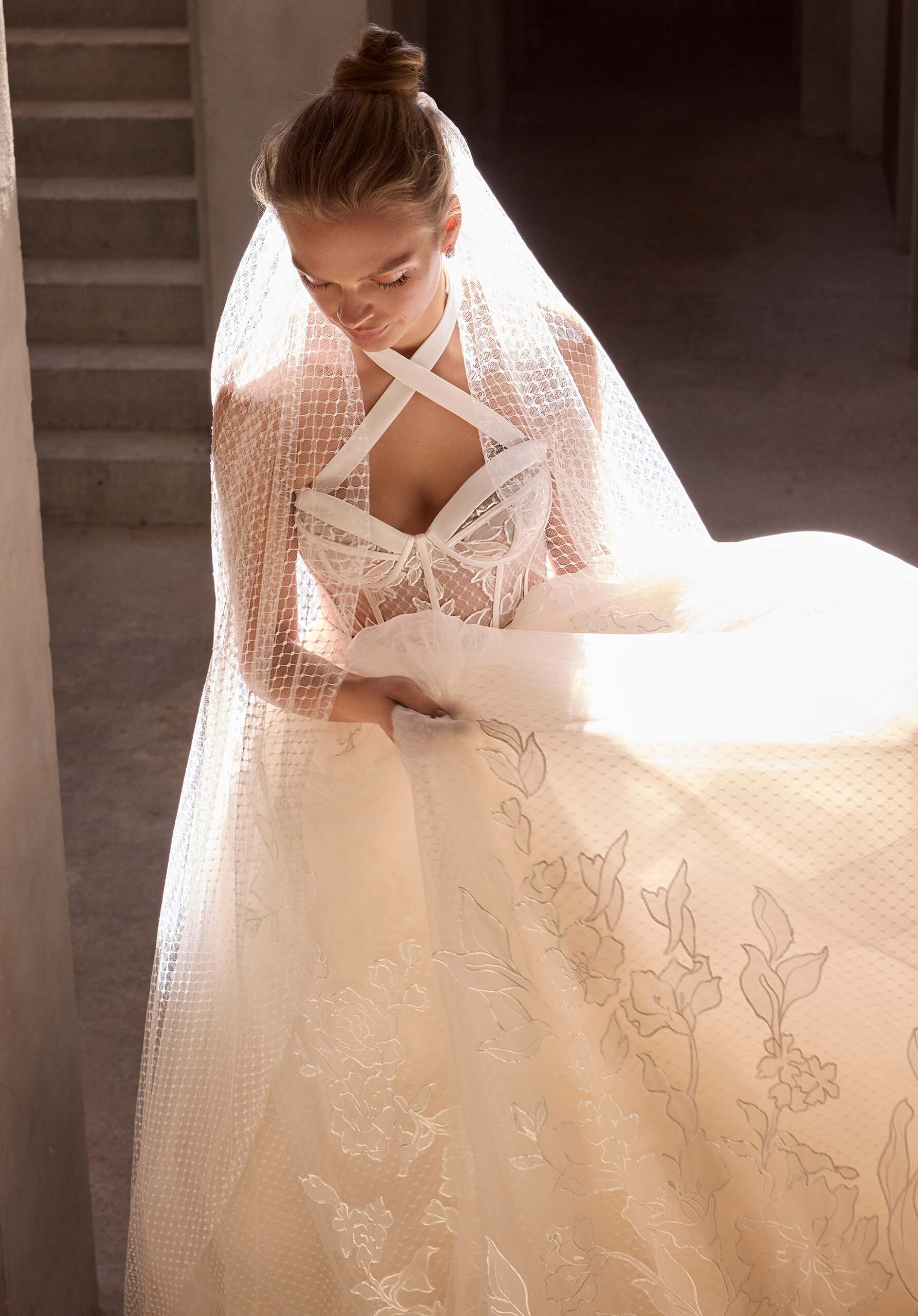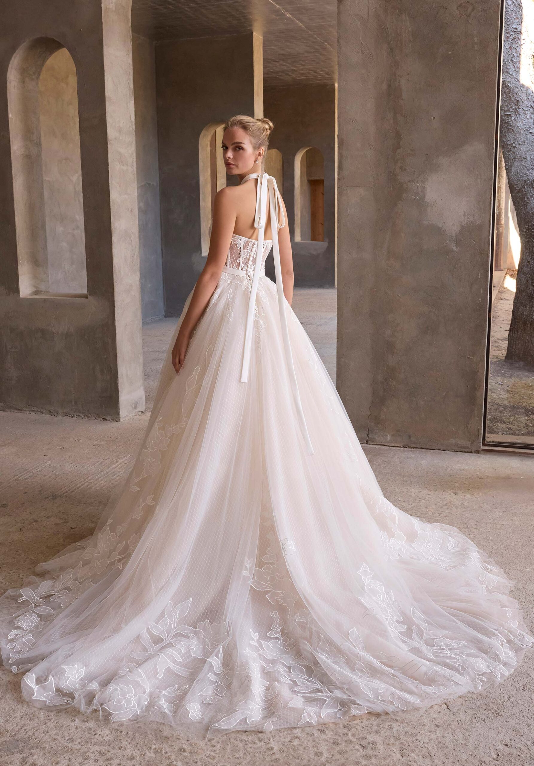 O vestido de noiva em linha A com bolinhas suíças tem um decote em coração com uma alça de cetim removível ao pescoço e uma saia de organza com aplicações florais.