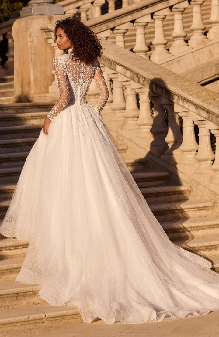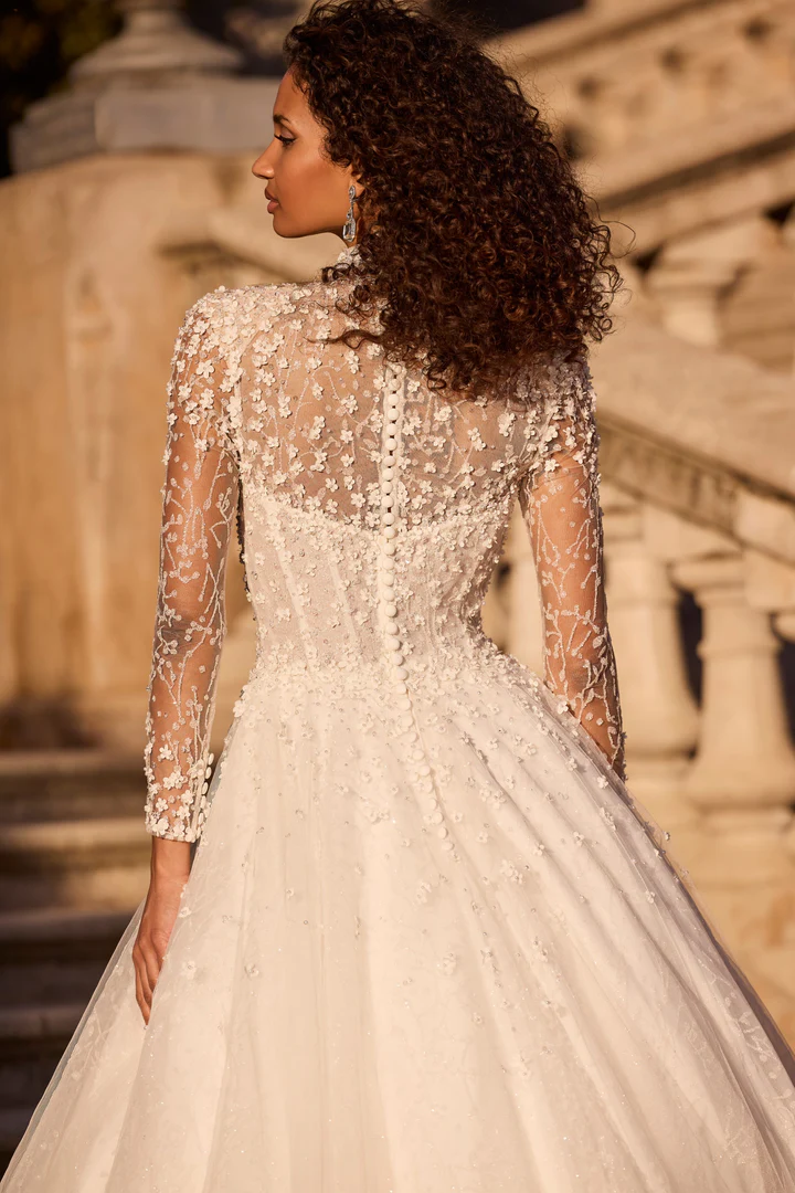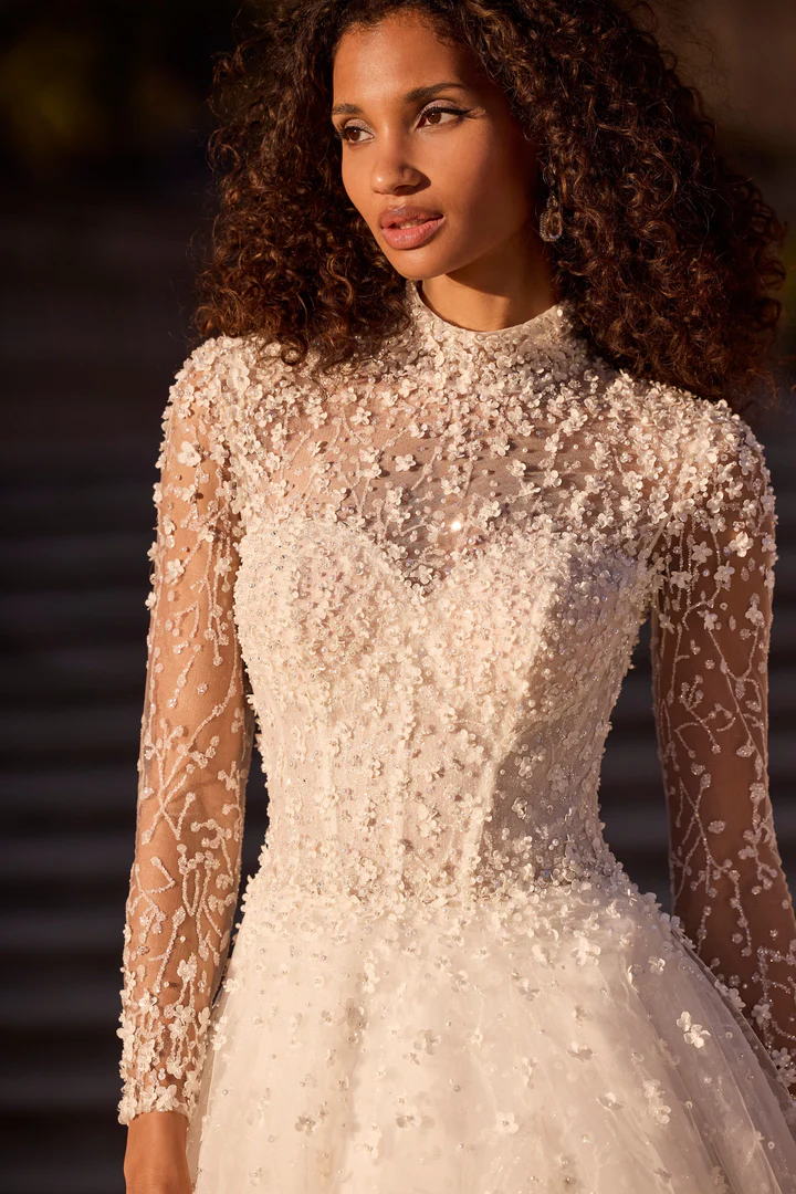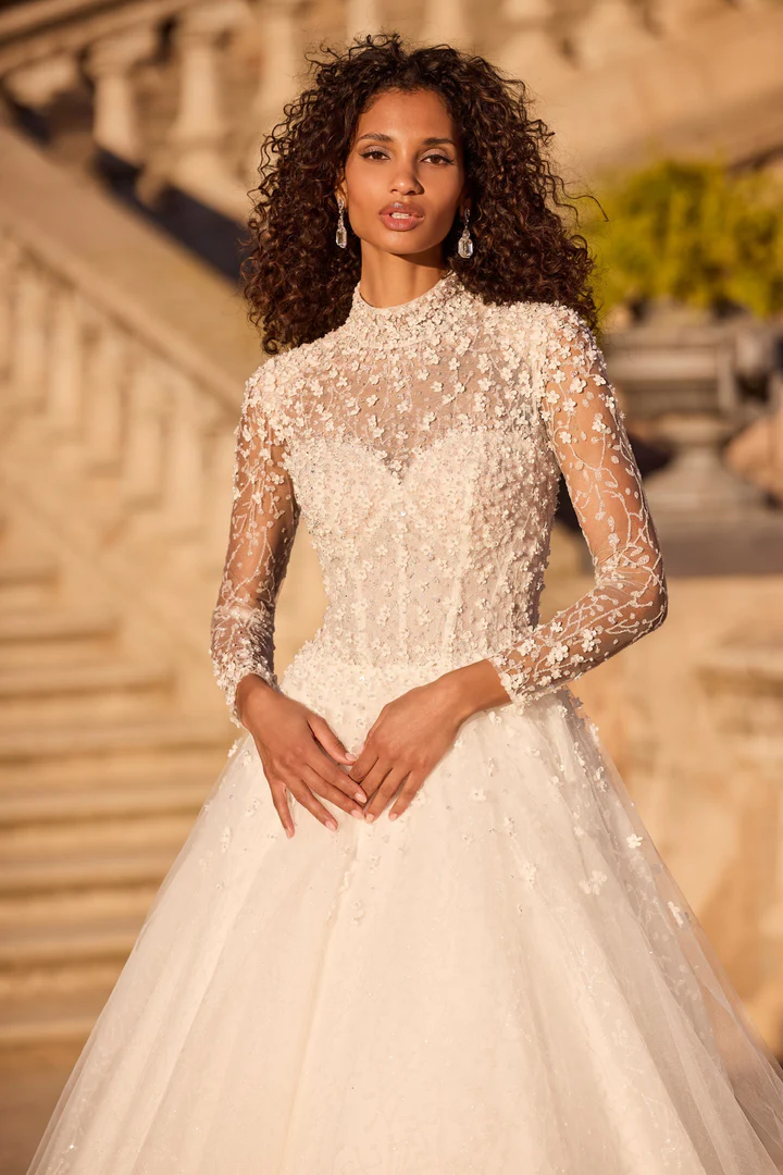 Um clássico vestido de noiva estilo princesa com renda floral 3D, gola alta com transparência oferecendo cobertura completa e mangas longas.