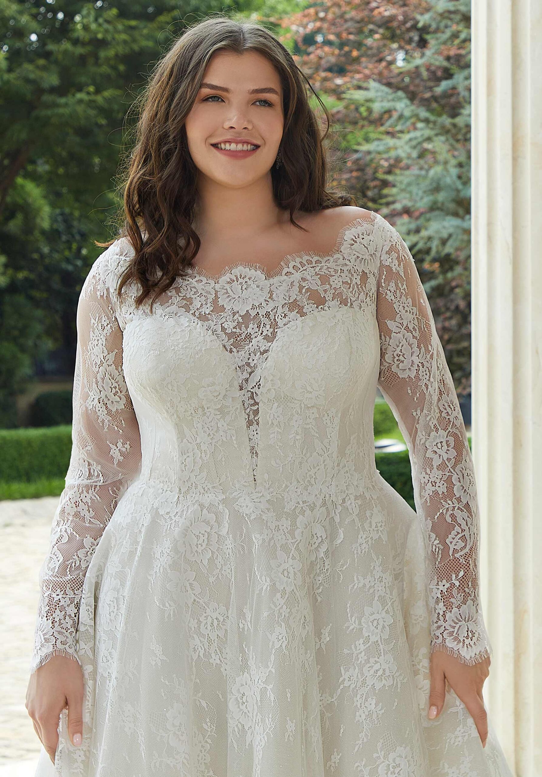 Vestido de baile tradicional em linha A com renda Chantilly por toda a parte sobre organza brilhante, com corpete ilusão decotado e costas transparentes.
