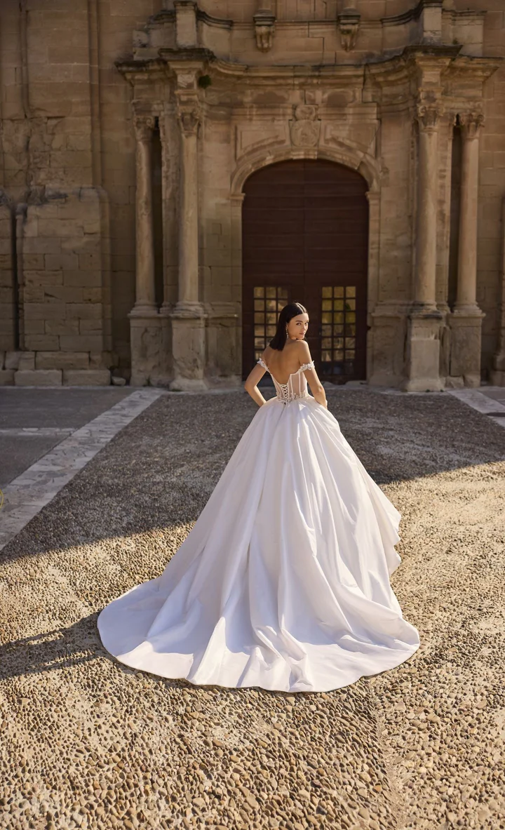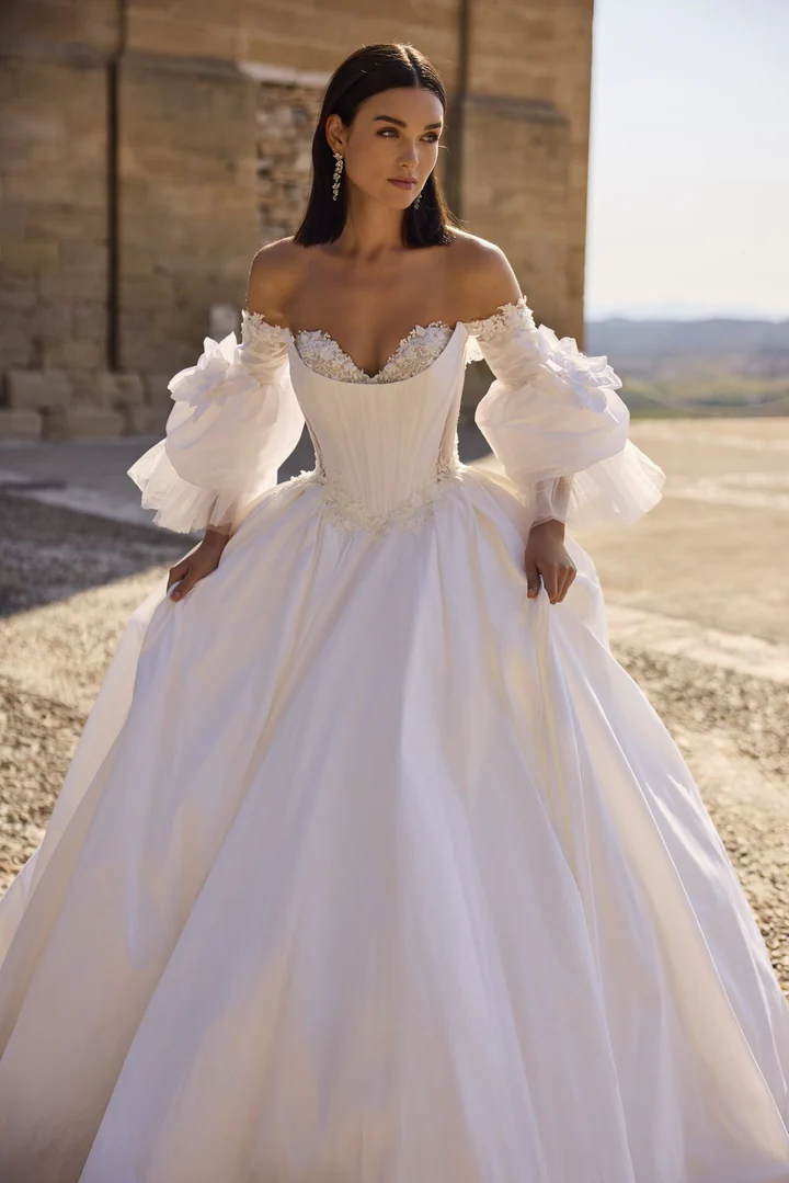 Um vestido de noiva em tafetá que combina o clássico e o moderno, no estilo ballgown, com cintura marcada, busto com detalhes florais, costas em corpete e mangas bufantes destacáveis presas às mangas caídas.