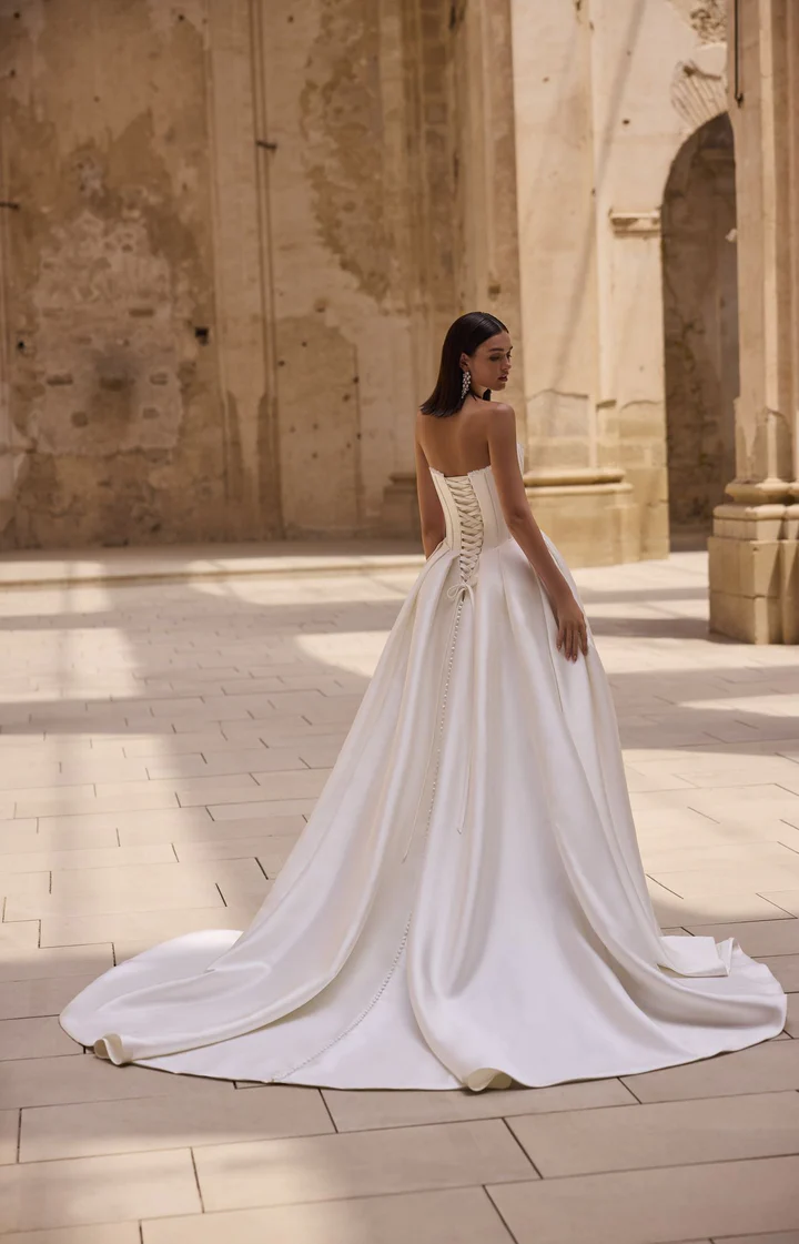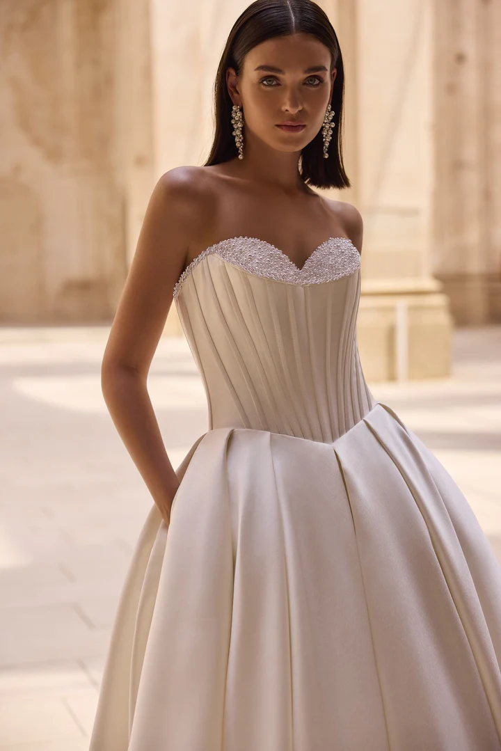 Um vestido de noiva princesa couture, no estilo ballgown, com corpete estruturado de barbatanas aparentes, decote tomara que caia em formato coração com pedrarias e costas em estilo espartilho.