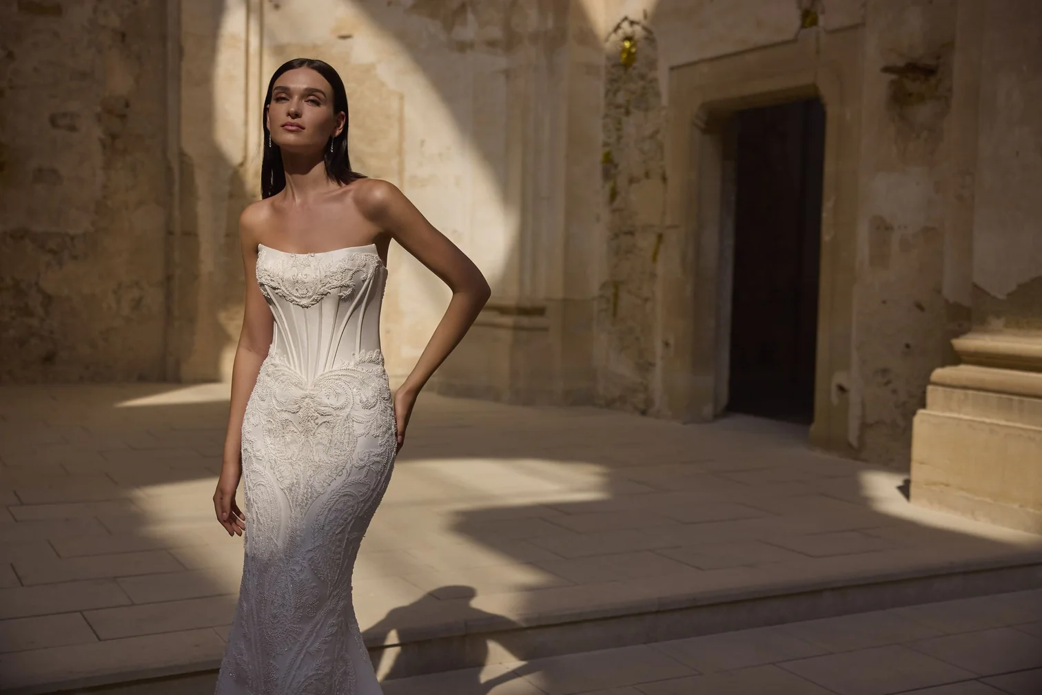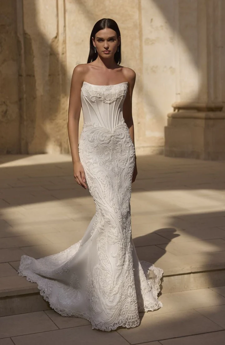 Um vestido de noiva moderno e elegante no estilo fit and flare (justo até os quadris e levemente aberto na saia), tomara que caia, com corpete estruturado em estilo corset e saia ricamente bordada com renda e pedrarias.