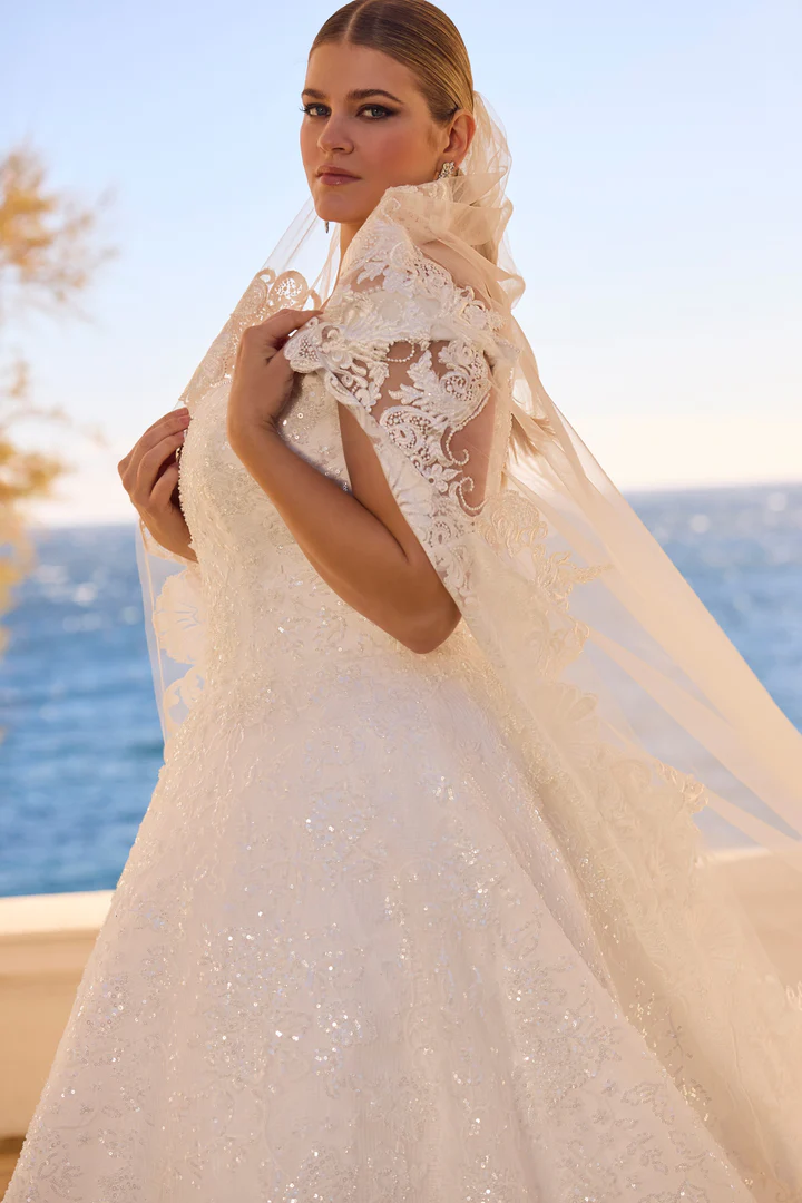 Um vestido de noiva princesa estilo ballgown em renda bordada com pedrarias, com decote arredondado, costas baixas e acabamento com borda de pérolas.