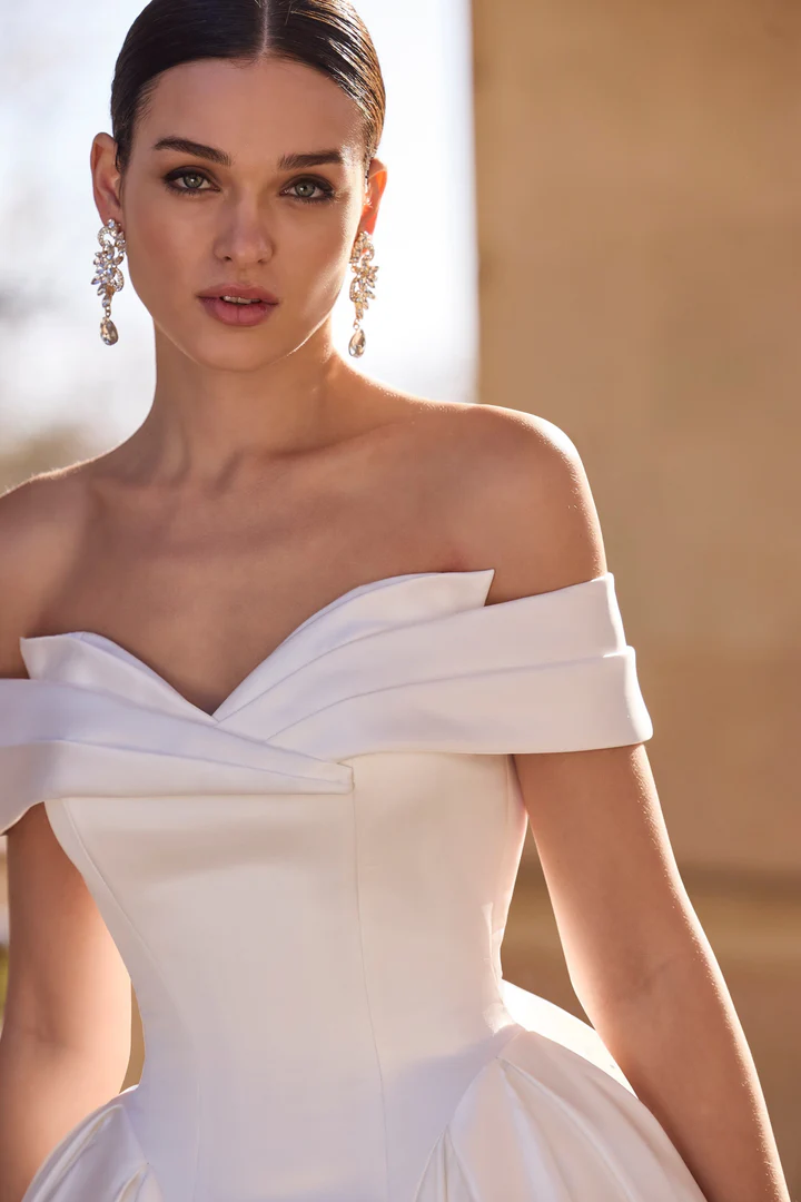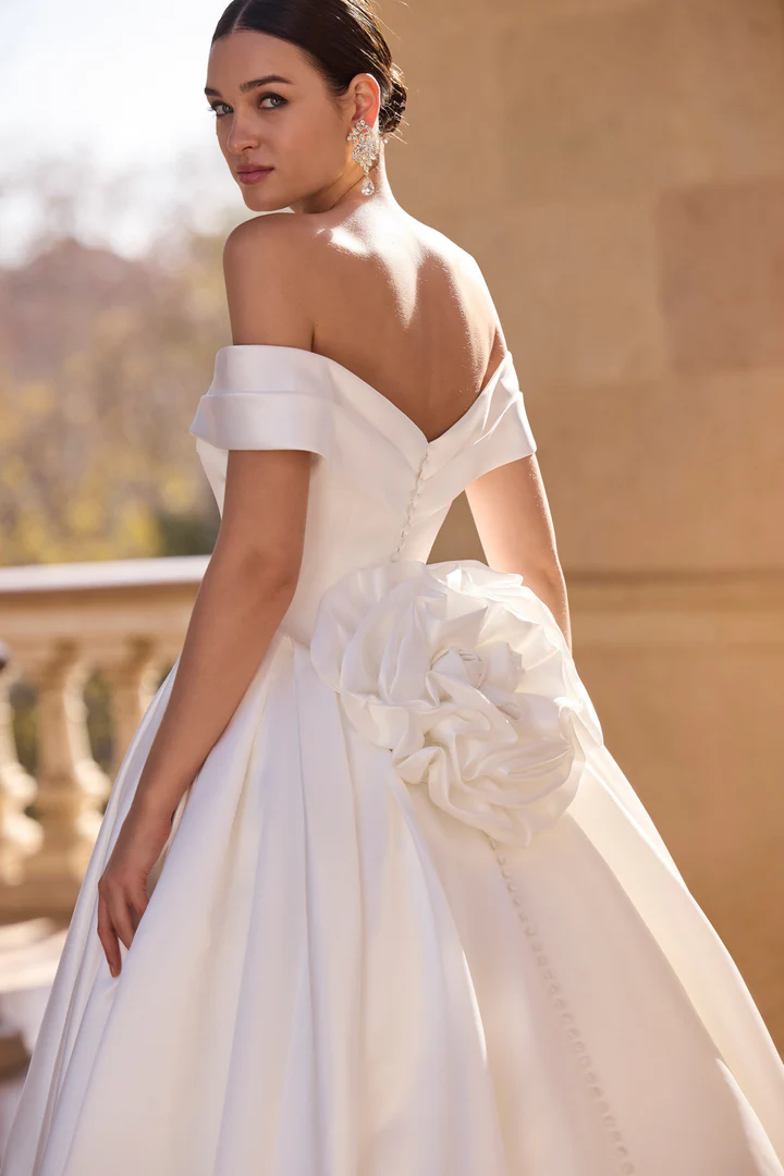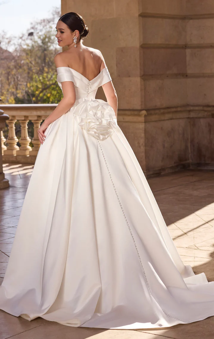 Um deslumbrante vestido de noiva moderno no estilo ballgown, com decote tomara que caia de design contemporâneo, corpete ajustado e detalhe floral nas costas.
