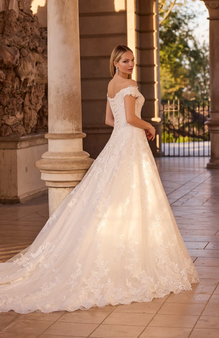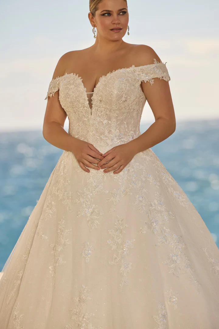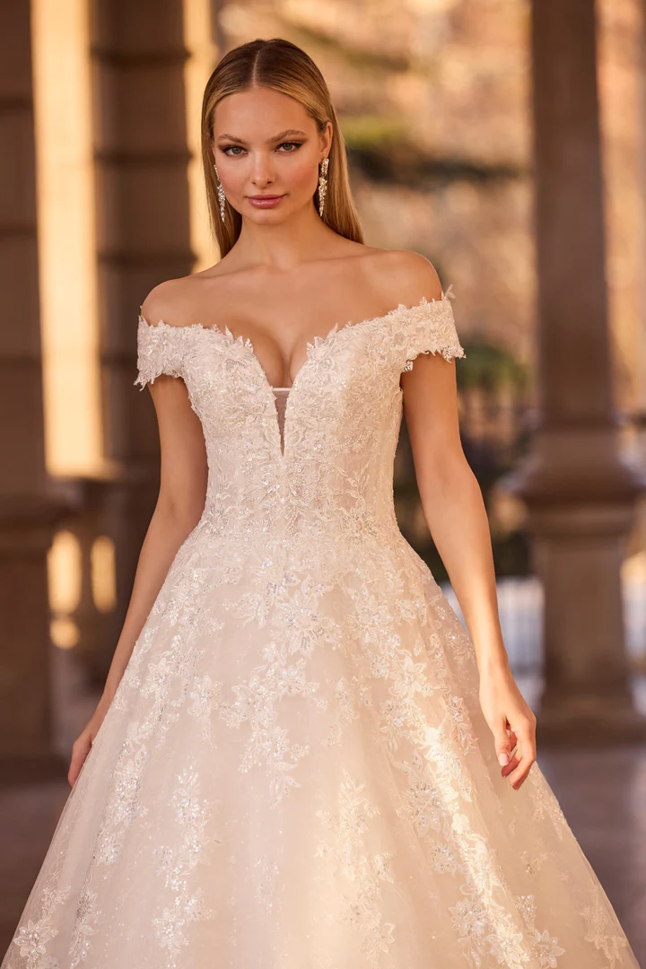 Um vestido de noiva ballgown ombro a ombro, confeccionado em renda botânica, com mangas caídas elegantes e costas em estilo espartilho.