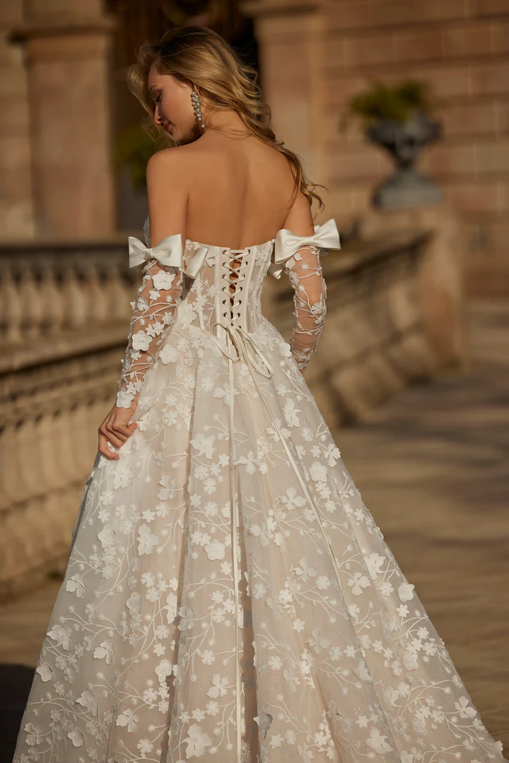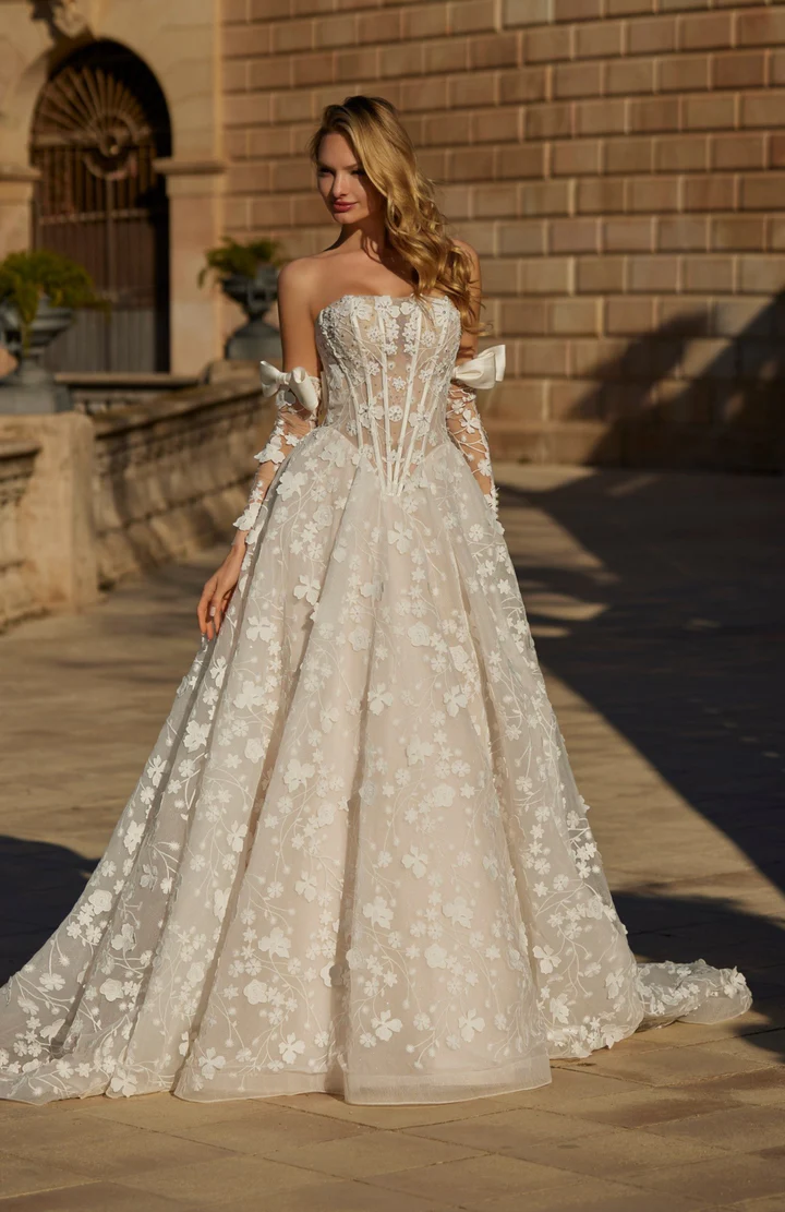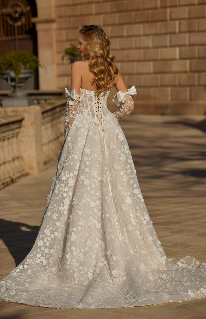 Um deslumbrante vestido de noiva de alta-costura, com corpete estilo espartilho, estruturado com barbatanas aparentes e amarras nas costas.