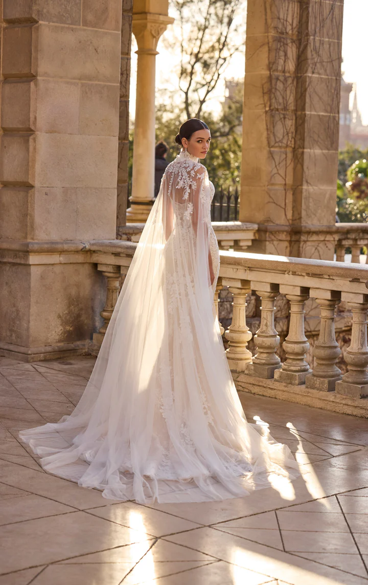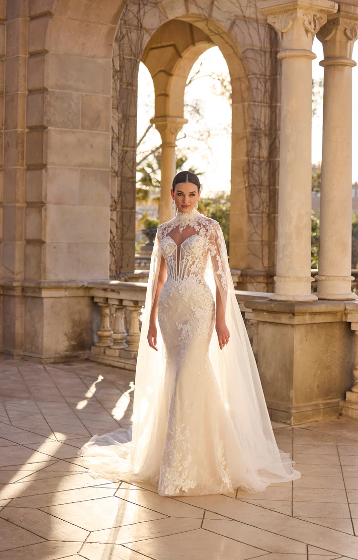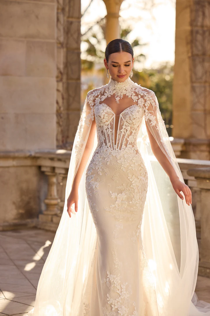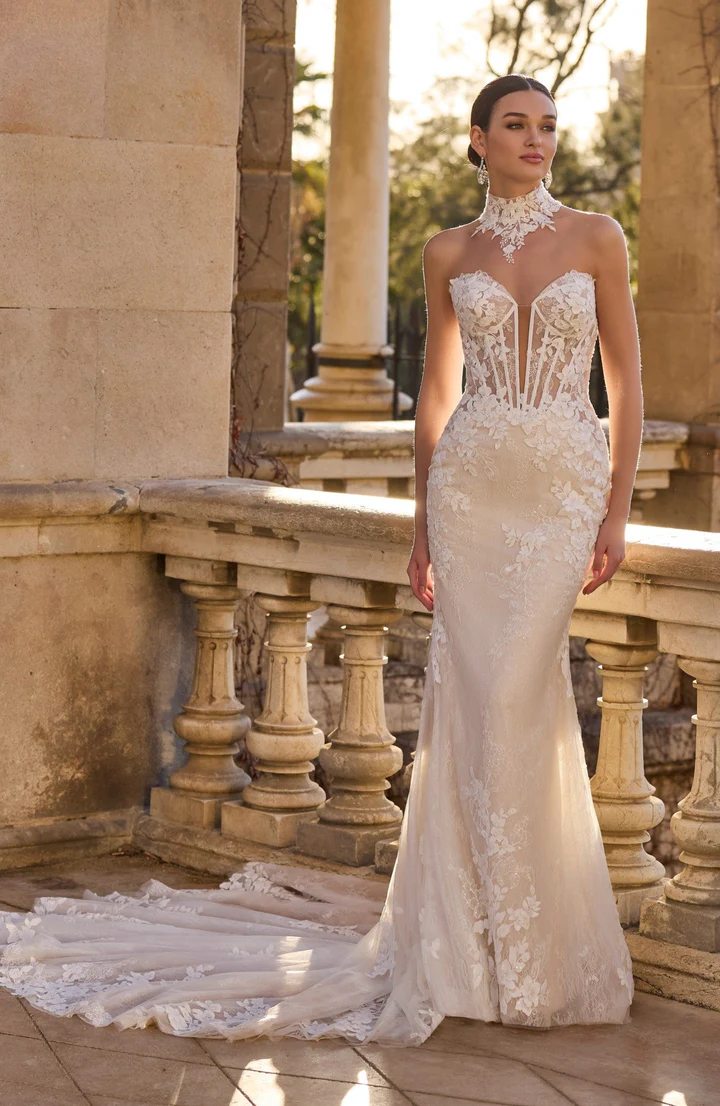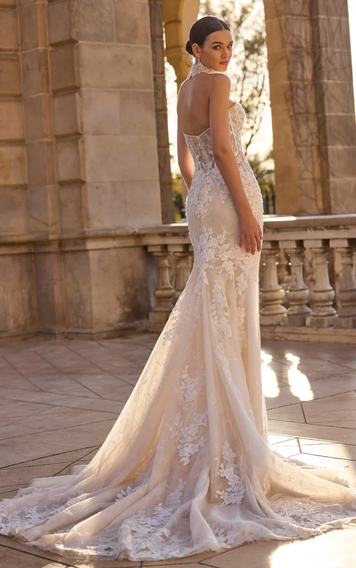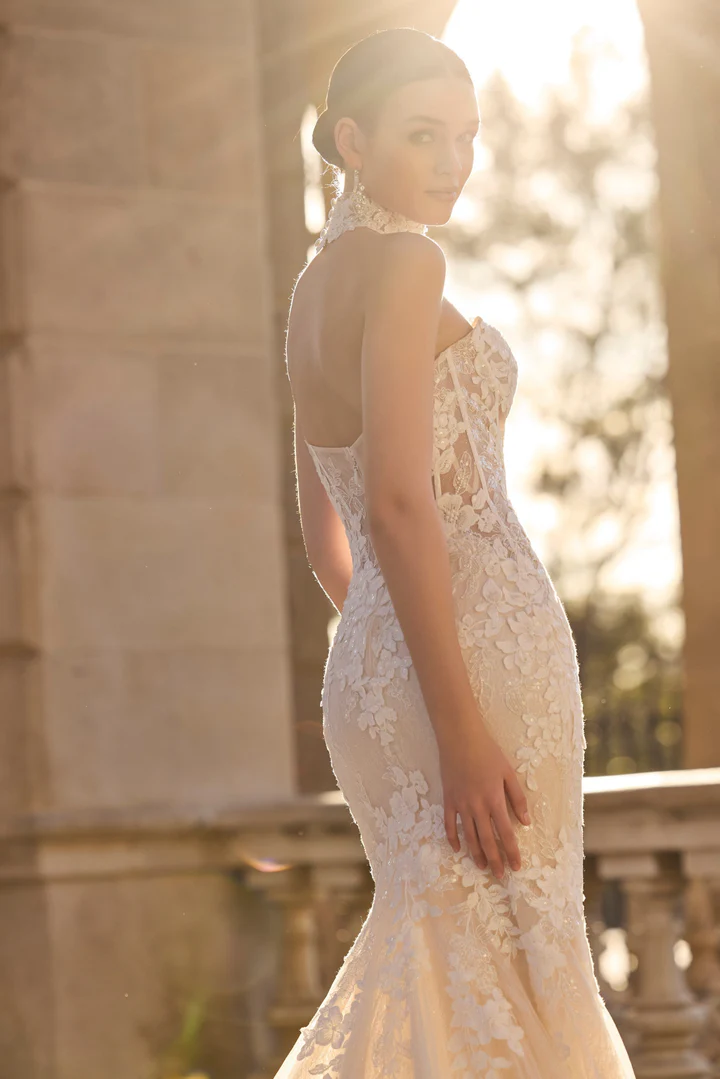 Uma sofisticada e atualíssima fit and flare que destaca um profundo decote em V, corpete estruturado com barbatanas aparentes e costas abertas. O vestido é finalizado com elegância por uma gargantilha de renda removível.