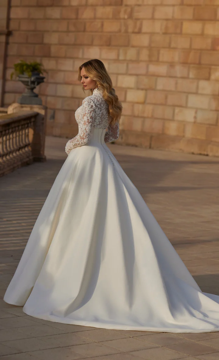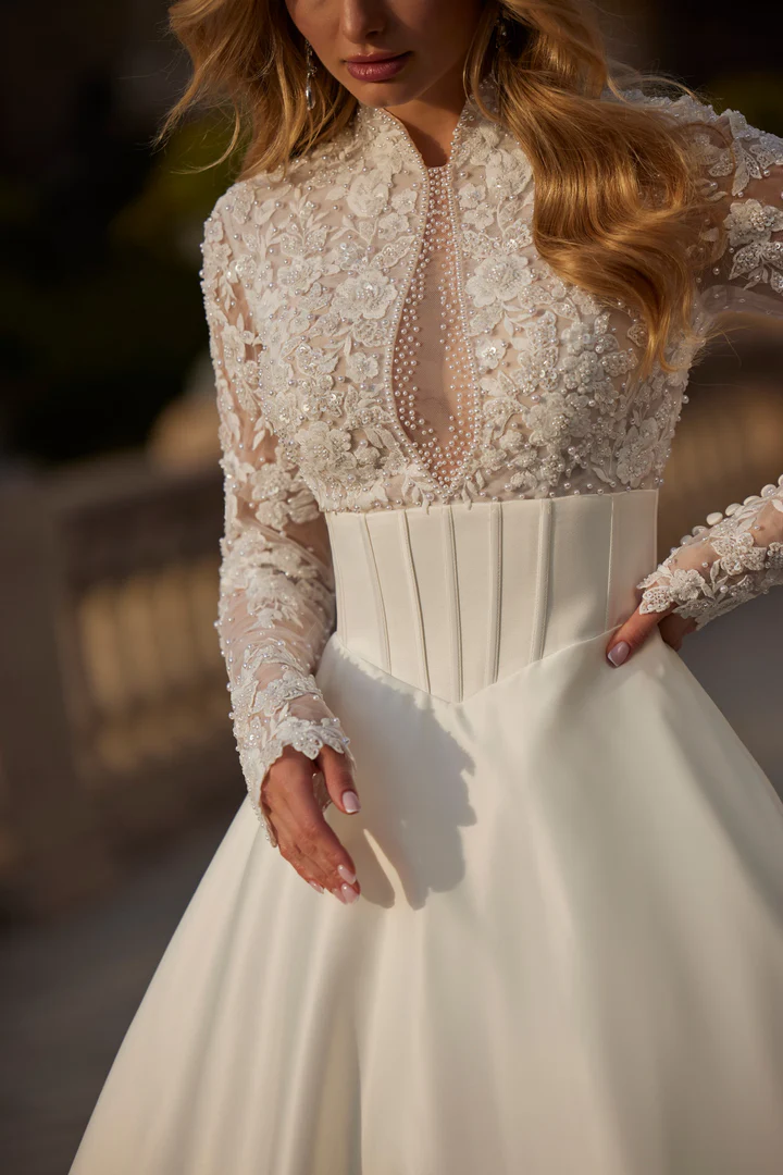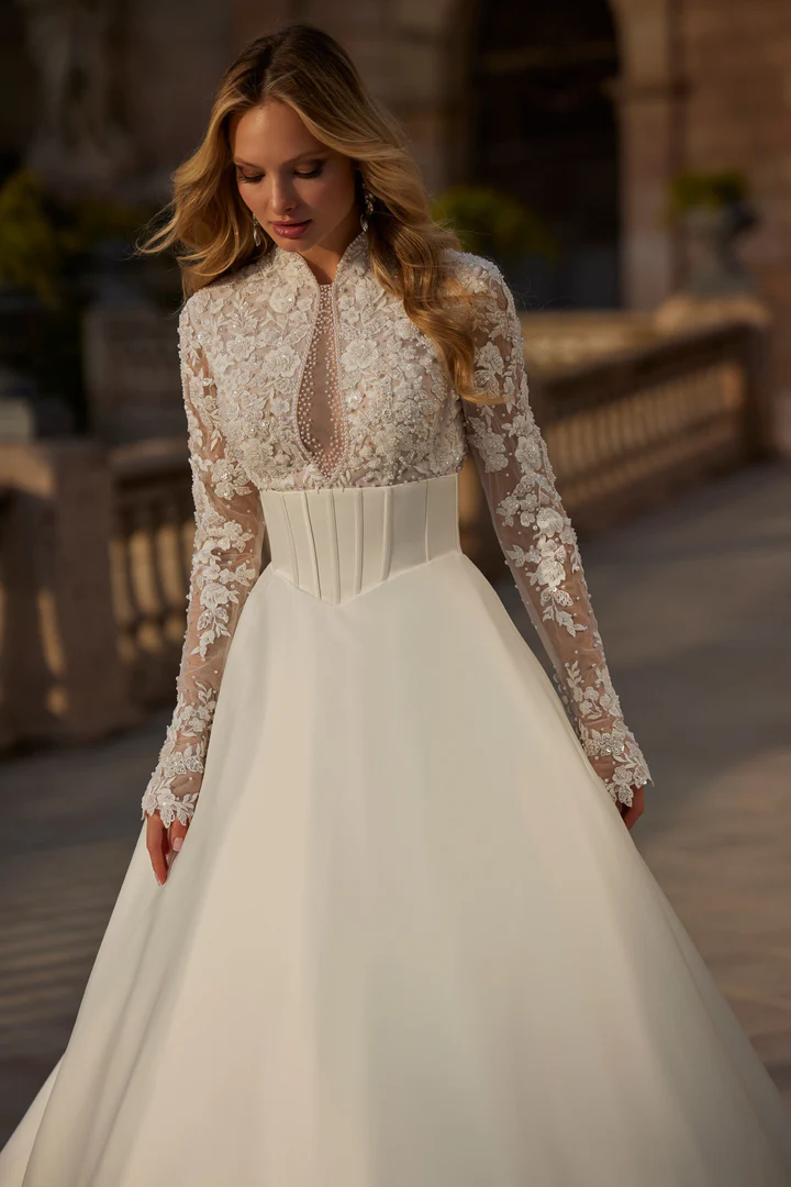 Um vestido de noiva ballgown moderno e elegante, com corpete marcante em renda e pedrarias, combinado a uma saia simples com pregas delicadas.